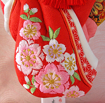 左側は赤綸子の小桜、小紋友禅梅柄。