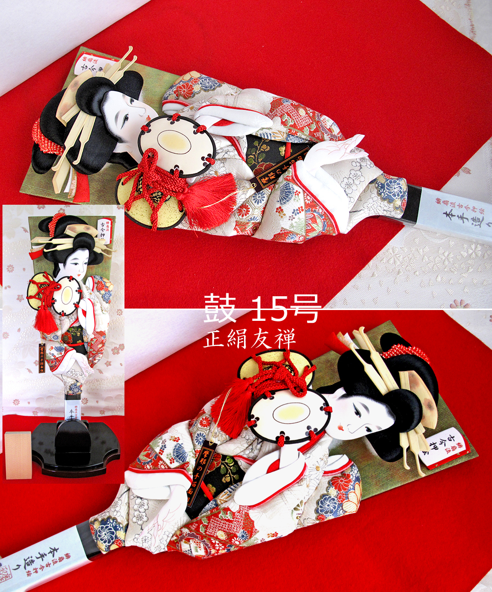 緑の向う張りに美しい友禅、鼓を持たせた羽子板です。